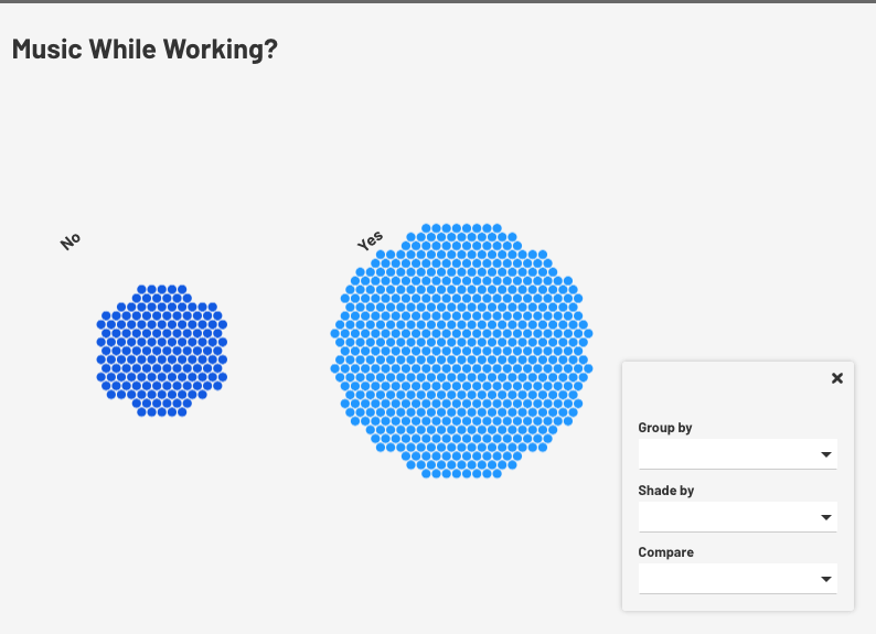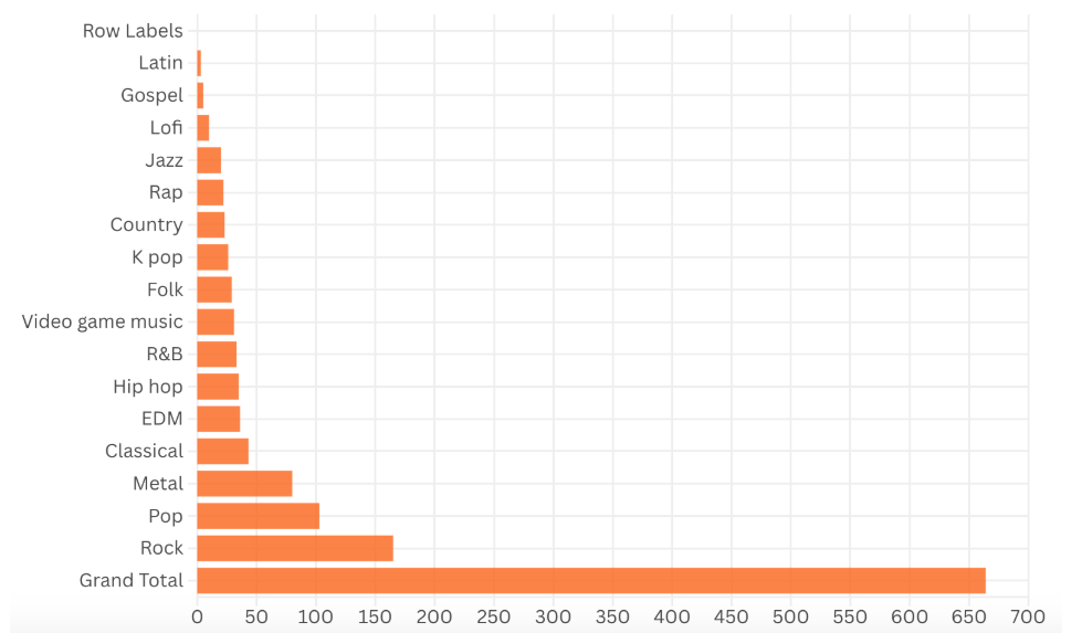 Adding to our exploration of music habits, we wanted to understand how people get and listen to their music, especially what streaming service they rely on when working. From the 855 survey respondents, Spotify was the dominant choice with 458 users which is more than half of the data. We found this not surprising because spotify contains a broad genre selection, it is very simple to use, and it has playlists made for work and focus which makes a great choice for listening while trying to get things done. Other streaming services we saw were significantly less used. Youtube music was next on the list with 94 users, followed by Apple Music with 51, and then Pandora with only 11 users. 71 of the survey respondents said they don’t use a streaming service at all which means they may rely on the radio or prefer silence during work. 50 of the respondents indicated they use a platform that was not listed in the options which opens the door to niche services or regional ones. While there is a big assortment in how people access their music Spotify has a strong lead as a go-to choice for streaming platforms in a work setting.